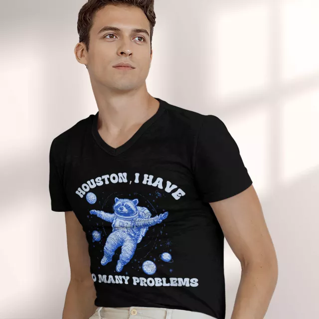 Houston I Have So Many Problems V-Neck T-Shirt – Retro Graphic Basic T-Shirt – Raccoon In Space Tee
