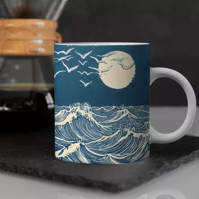 Vintage Sea and Moon 11oz Mug – Sea Waves Ceramic Mug – Full Moon Coffee and Tea Cup